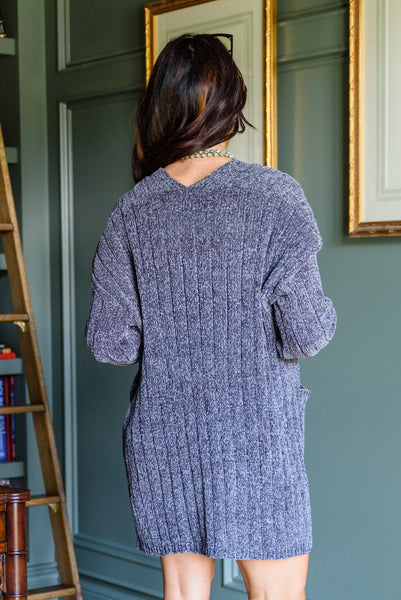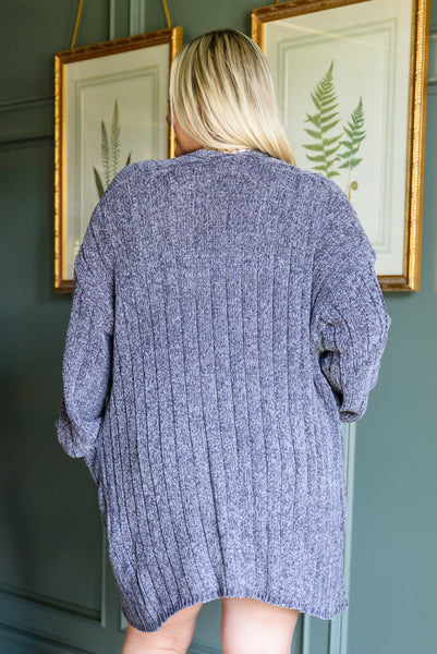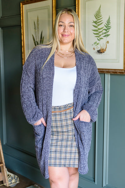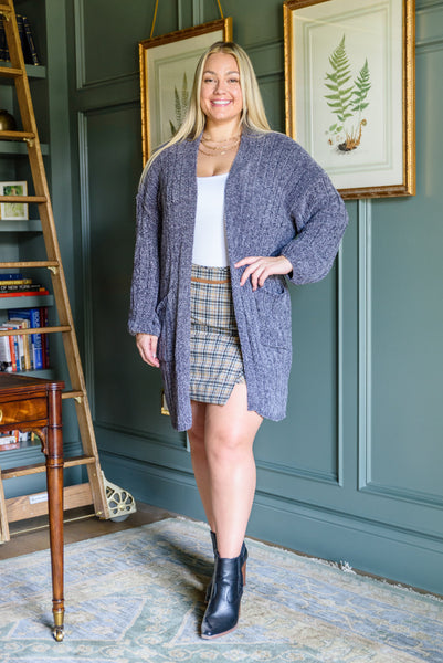 Stay toasty while looking chic in the Mountain Mornings Cardigan In Charcoal! In an ultra soft chenille you'll never want to take this cozy cardi off! Featuring an open front, with a drop shoulder and slouchy long sleeve, two front patch pockets and a midi length. For an early fall look, pair with distressed denim cutoffs, combat boots and a bodysuit.