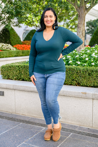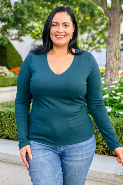 Life just got easier because of the My Own Way V Neck Ribbed Top In Pine! A stretchy ribbed fabric shapes a v-neckline, slim fit bodice and long sleeves. A built-in padded bust makes this top easy to slip on in the mornings. Toss a shacket over this and add your favorite jeans for an easy but cute look!