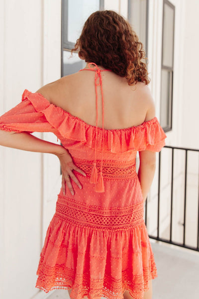 The Myknonos Dress is a fun and flirty summer style. Featuring beautiful crocheted lace details and adorable ruffle sleeves, this dress is a show stopper. Pair this with some strappy sandals or nude heels for a special occasion.
