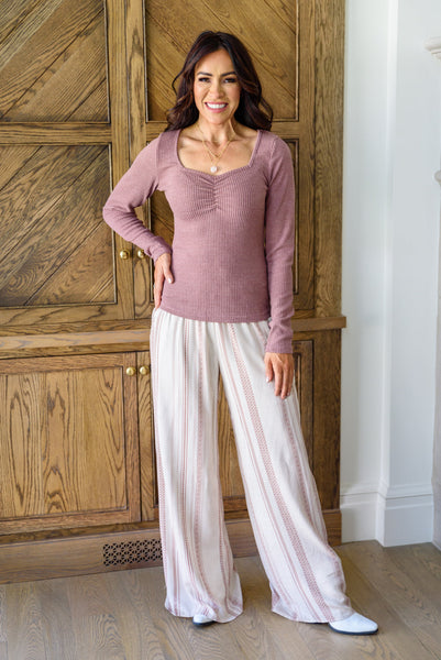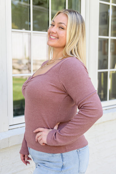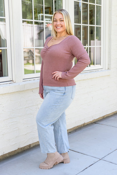 Cooler weather means it's time for the New Connection Long Sleeve Ribbed Top. It will make layering in the Fall easier than ever! Featuring a beautiful sweetheart neckline with ruched detailing, long sleeves, and slim fit. The ribbed knit adds a fun pop of texture you'll love!