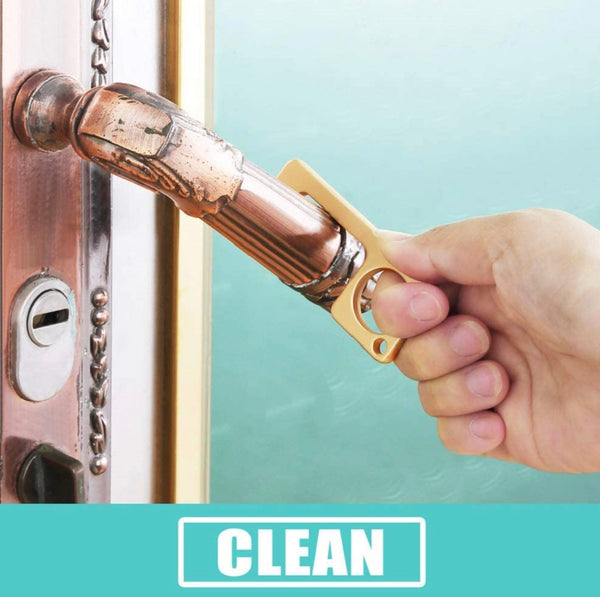 Does anyone else cringe when having to touch door handles in public these days?? If so, this is a handy dandy "tool" to keep on your keychain. It will help with opening doors, pushing shopping carts and pushing various buttons that you would normally touch. Made of metal with a colored coating. Please do not replace this tool with Hand Washing 🙂