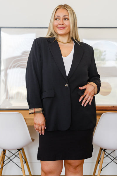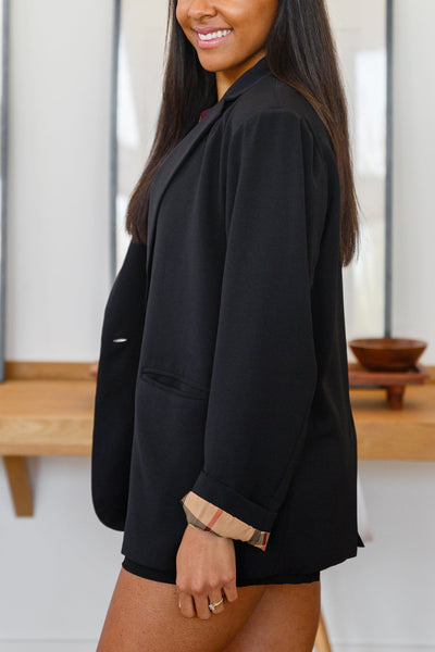 Everything you could ever want in a blazer is right here with the Notting Hill Plaid Lined Blazer In Black! Featuring a collared neckline with notched lapels, and long sleeves. An oversized silhouette (with a back vent) boasts a single faux tortoise shell button closure and two front flap pockets. Plaid print lines the body and sleeves for an ultra chic look!