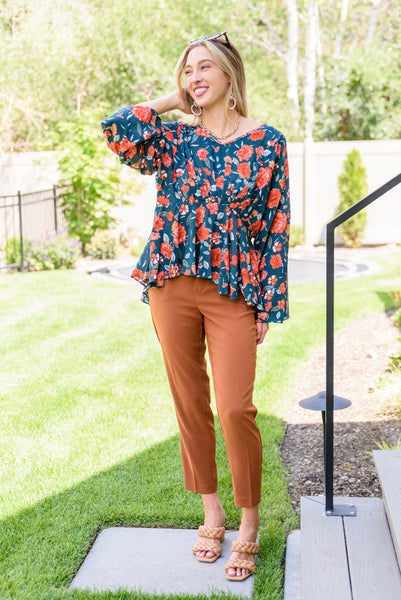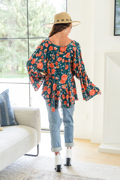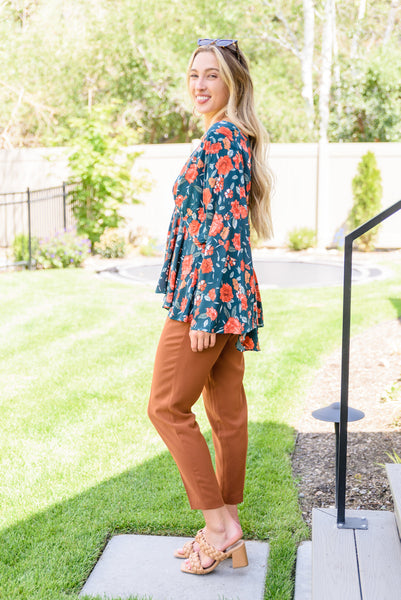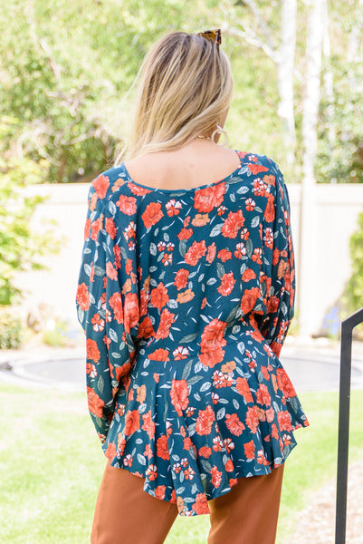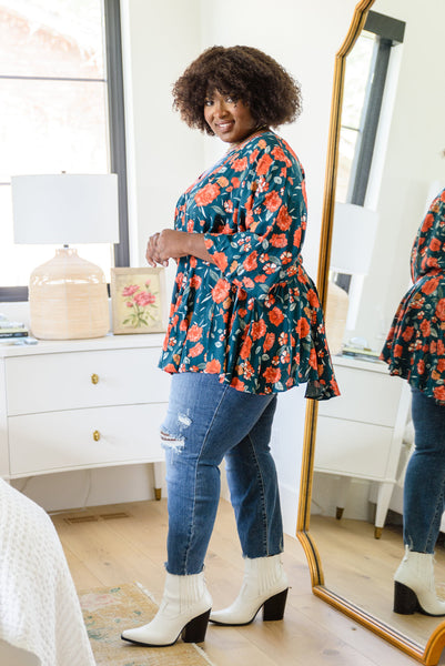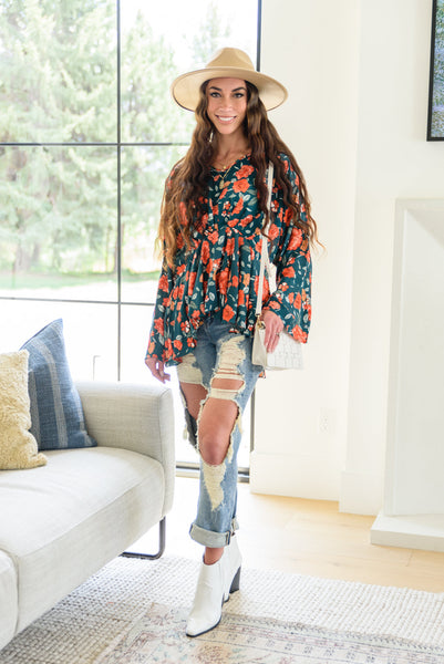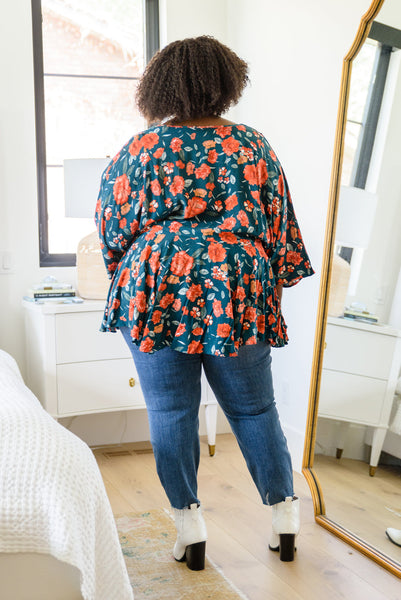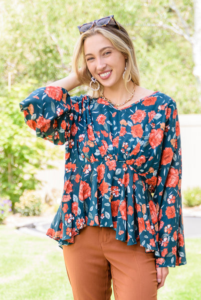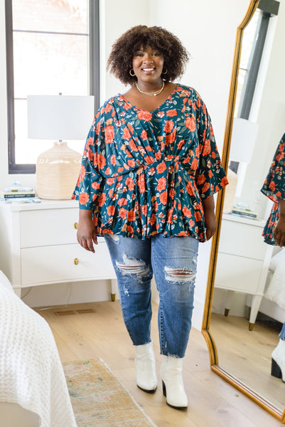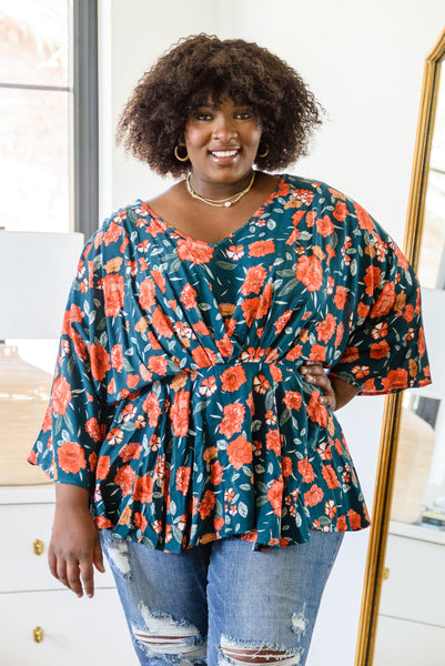 The On To The Next Vibe Blouse is all about the details! A lightweight woven fabric shapes a v-neckline that flows into an elastic waistline with pleated detailing, falling into a peplum design with kimono style sleeves. The stunning fall inspired floral print only makes this shirt that much better! Pair with dark wash denim and heeled boots for a cute look!
