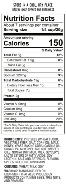 Pretzels (wheat flour, vegetable fiber, salt, corn oil, malt, honey, yeast, soda) canola oil, sugar, palm kernel and cottonseed oils, nonfat dry milk, milk, glyceryl lacto esters of fatty acids, soy lecithin, salt and artificial flavors, spices including cinnamon