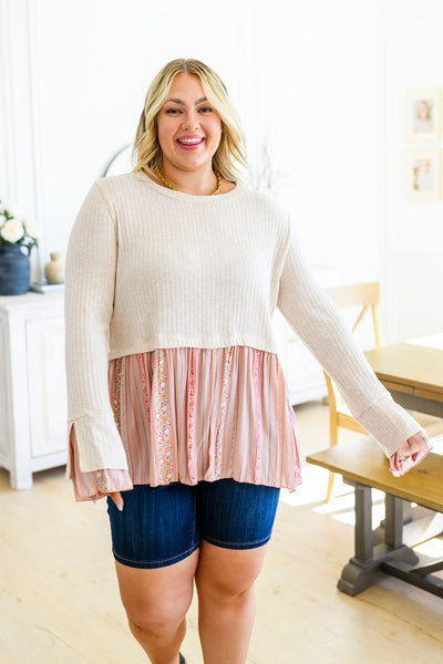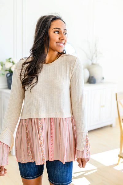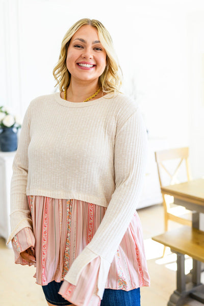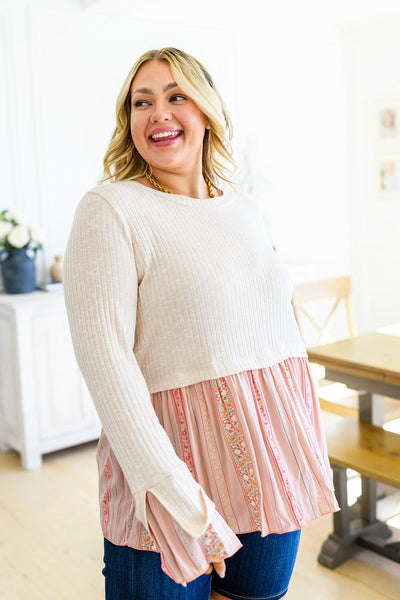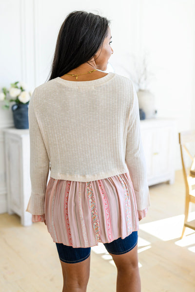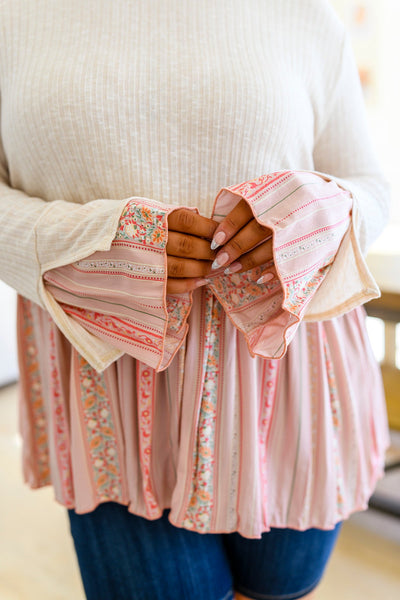 Discover the perfect combination of fashion and comfort with the Patiently Waiting Peplum Top. Soft ribbed knit combined with a woven floral striped peplum and peplum split bell sleeve make this top a truly unique combination of style and comfort. Show off your sense of style and feel great doing it!