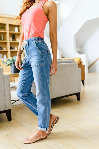 Experience the perfect fit and style in the Payton Pull On Denim Joggers from Judy Blue! Made with a high rise and zero distressing, these medium-wash joggers offer an elastic waistband, functional drawstring, and patch pockets for a comfortable, adjustable fit. With an optional rolled cuff, you'll look and feel effortlessly chic. Are you ready to feel confident and stylish? Try Payton Pull On Denim Joggers today!