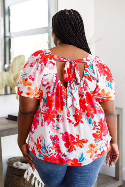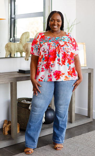 Statement pieces like the Piano Puff Sleeves Blouse are going to draw attention and compliments! Lightweight non stretch fabric shapes a square paneled neckline with puff sleeves ending at elastic cuffs. A flowy fitting bodice gathers at the bust and falls into a subtle a-line silhouette with a tie detail back cut out. Stunning floral embroidery decorates the neckline accenting a gorgeous red and orange floral print.