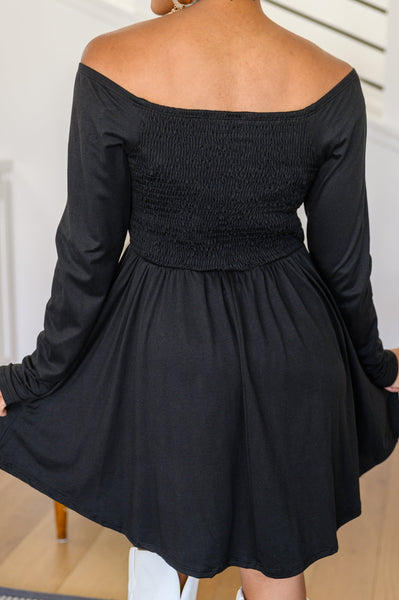 The Picture Perfect Long Sleeve Skort Dress In Black is nothing short of perfect! The off shoulder neckline is complete with an elastic hem, dropping into a smocked bodice that tops a flowy mini skirt with built in shorts and two patch pockets. Pair this adorable dress with knee high boots, a cardigan, and a matching bag for a complete look!