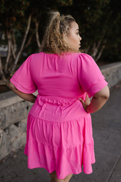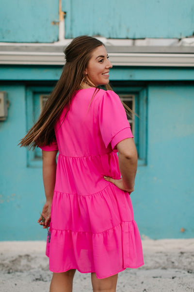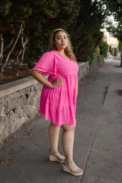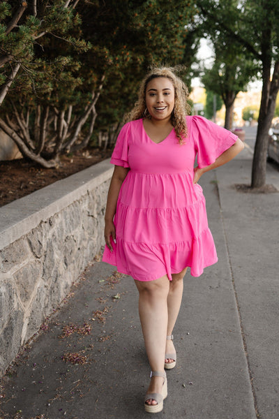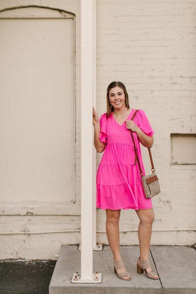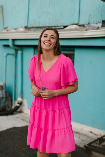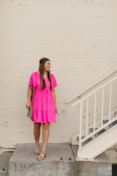 The pretty ruffled sleeves and tiered body give this dress that extra bit of class. We love that this dress can be styled with strappy sandals for a fun daytime look or wedges for the perfect evening out look. Also available in black.