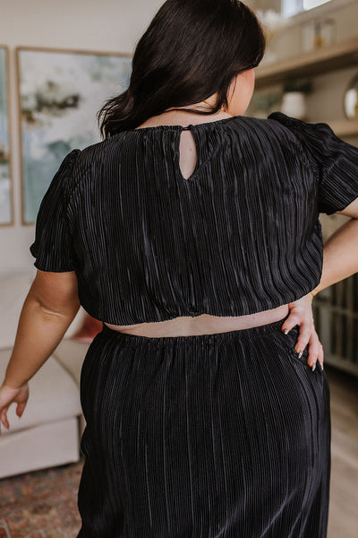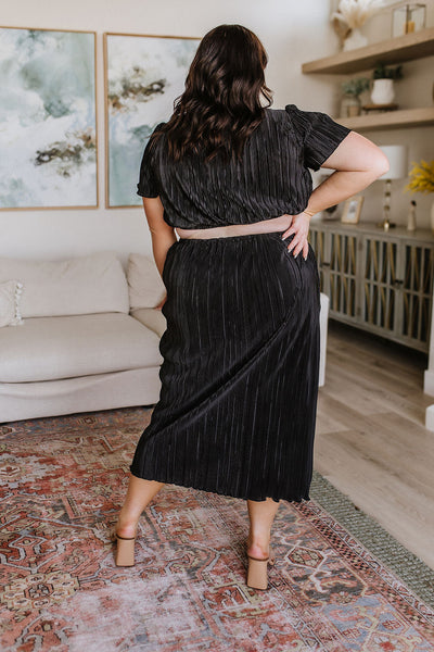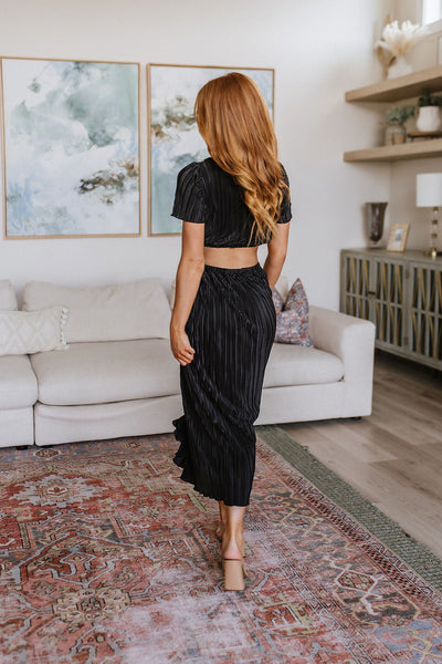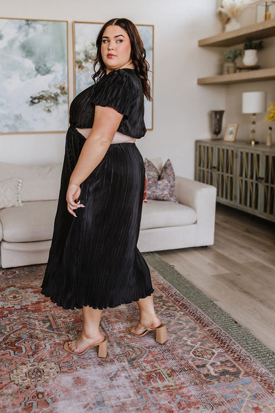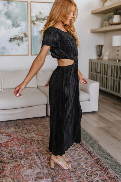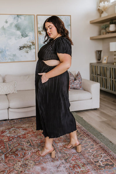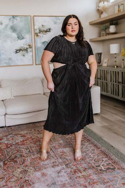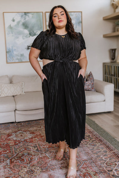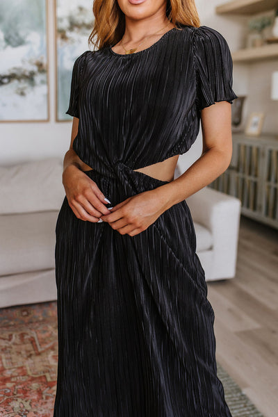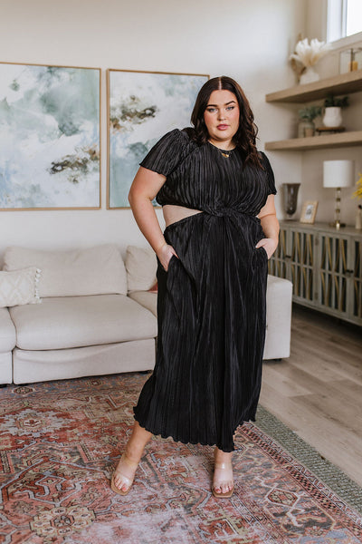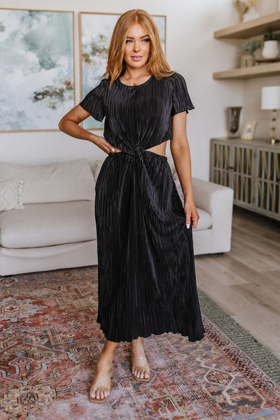 Discover the perfect mix of comfort and style with the Pocket Full of Sunshine Plisse Maxi Dress. Made with beautiful black accordion plisse fabric, this timeless piece features a twist front, pockets, an elastic waistband, and a keyhole button closure. With a midi length that moves with you, you'll feel like you have a pocket full of sunshine all day long.