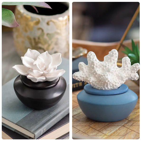 Porcelain essential oil diffusers can be filled with 100% pure essential oils, or with water and oil to diffuse fragrance that lasts up to 2 weeks. A decorative porcelain top rests on a ceramic base to bring a natural beauty to your space.