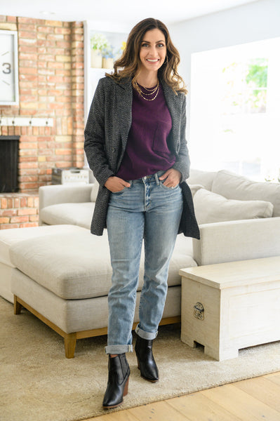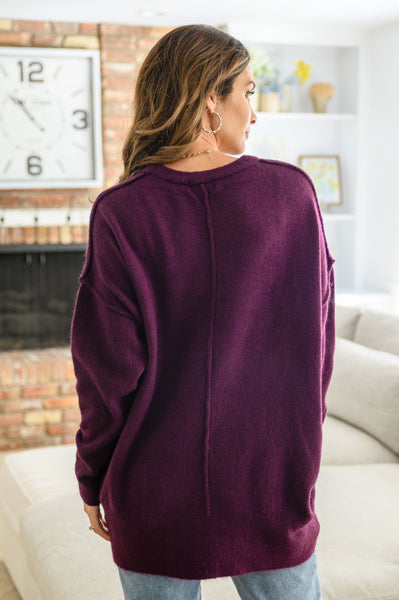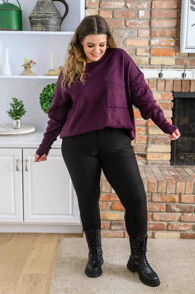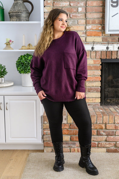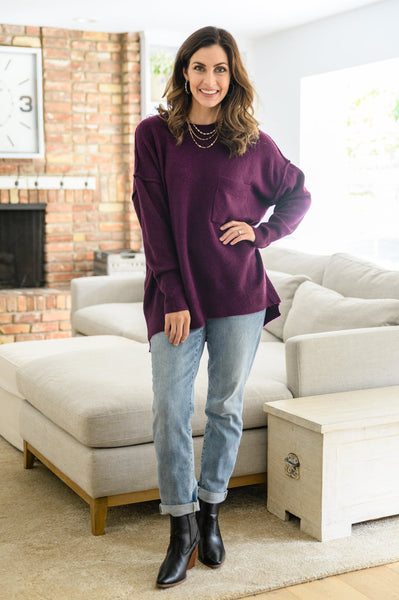 The Right Direction Pocket Sweater In Dark Plum is the perfect addition to your sweater collection! Featuring a round neckline that tops a loose fit bodice and long sleeves with drop shoulder detail. Exposed seam detailing adds a fun and unique touch! Pair with leggings and black boots for a comfy but stylish look!