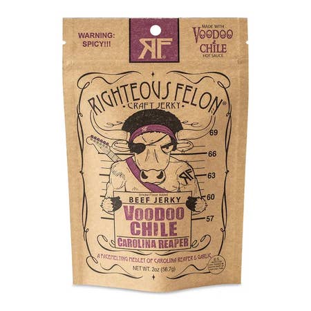 Righteous Felon Jerky Cartel specializes in producing and trafficking high-potency beef jerky made with illegal combinations of unique, all-natural ingredients. In today's world, it’s rare to find a pure jerky product that hasn't been mass produced in a mega-factory and stepped on with chemical preservatives and low-grade ingredients. Righteous Felon is different – and you’ll know the difference when you tear through your first bag!