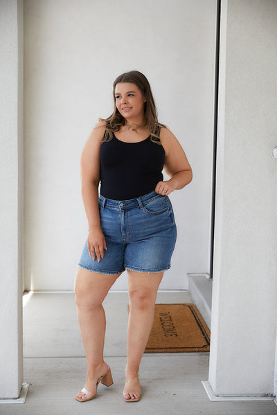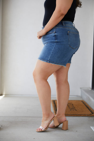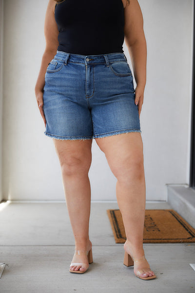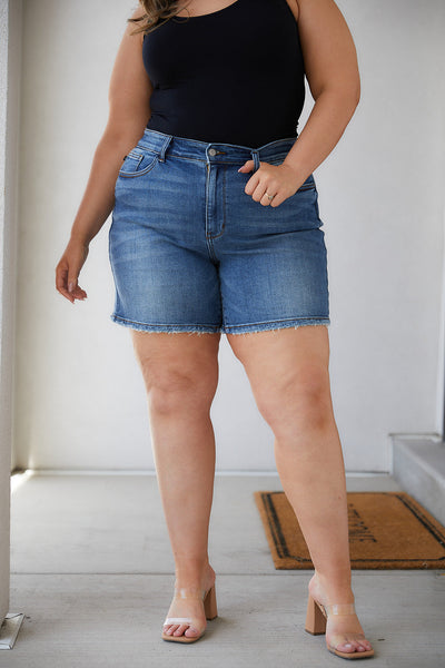 Experience the summer in style with Rory High Rise Denim Shorts - they make a statement! These shorts have a high rise, a classic denim look, a distressed hem, and a slightly longer inseam for a comfortable fit. Look and feel fabulous in these shorts - perfect for a day in the sun or a casual night out!