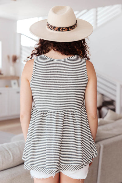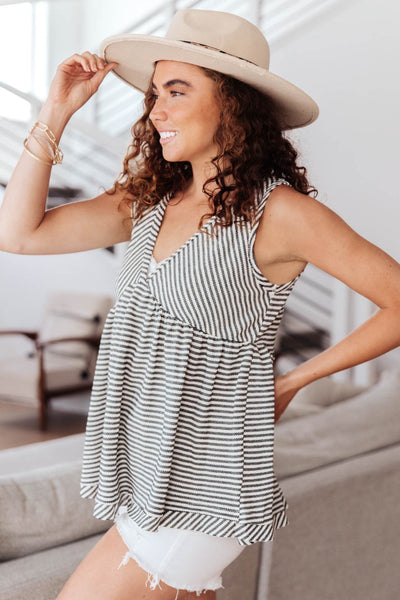 The Sammy Swing Top is a fun twist on a classic black and white striped tank. The low-cut v-neck and breezy bottom create a darling silhouette. Pair this top with shorts and sandals.