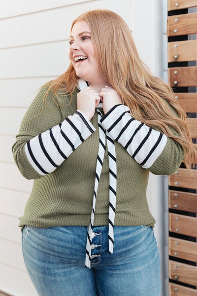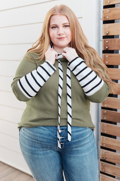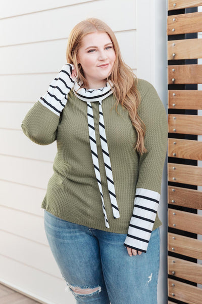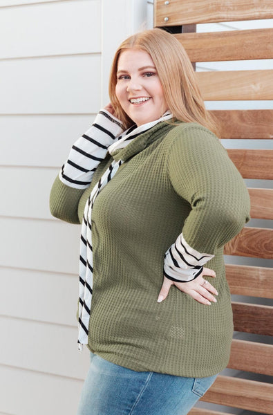 This adorable cowl neck top mixes a soft waffle fabric with black and white striped accents. This top is soft and stretchy and perfect for transition weather! Pair it with jeans and a beanie for a fabulous fall look.