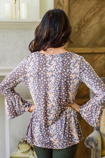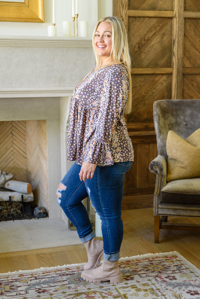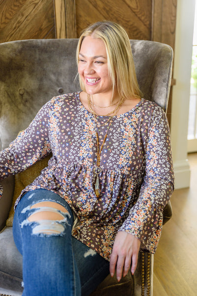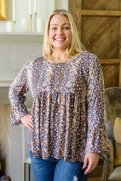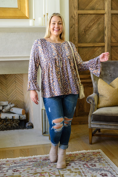 Let your style blossom in the Sense Of Peace Long Sleeve Top! The baby doll silhouette, subtle bell sleeves, and floral print create an adorable look while the light weight, stretchy fabric makes this the perfect transitional top into fall!