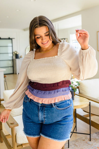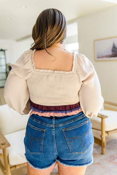The Shirley Smocked Ruffle Blouse is a treat for your wardrobe! The soft and lightweight satin-like fabrication plus the fitted, mid-crop design gives you a flattering silhouette. The color blocked smocked bodice and ruffled square neckline make it a uniquely feminine addition to your wardrobe.
