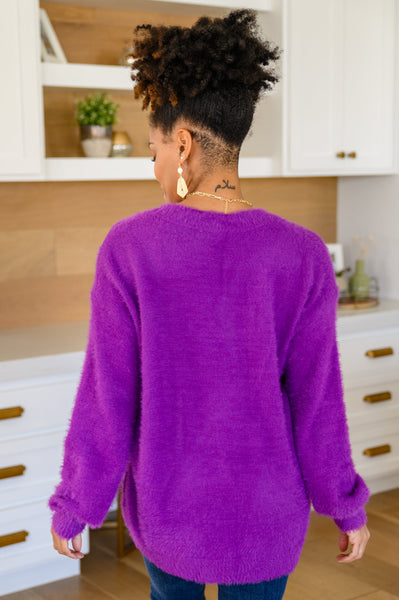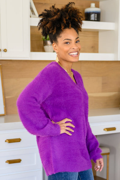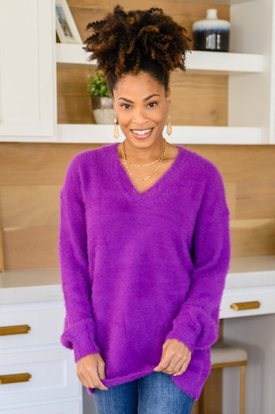Keep it cozy this season in the Sierra Long Sleeve Eyelash Sweater Knit Top In Purple! Featuring a relaxed fit bodice that boasts a v-neckline with long sleeves. This slouchy sweater is extra cozy made from a solid eyelash knit gauranteed to keep you looking stylish and chic!