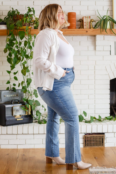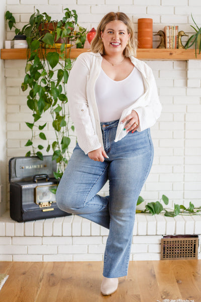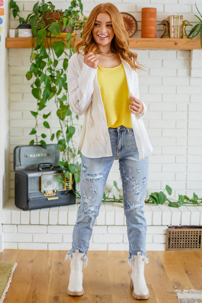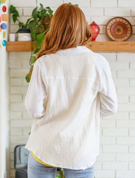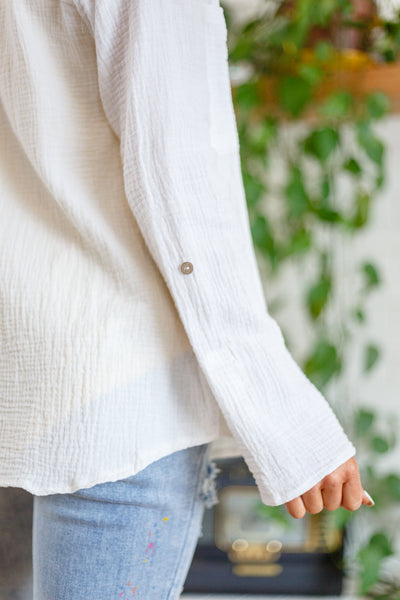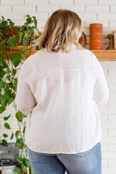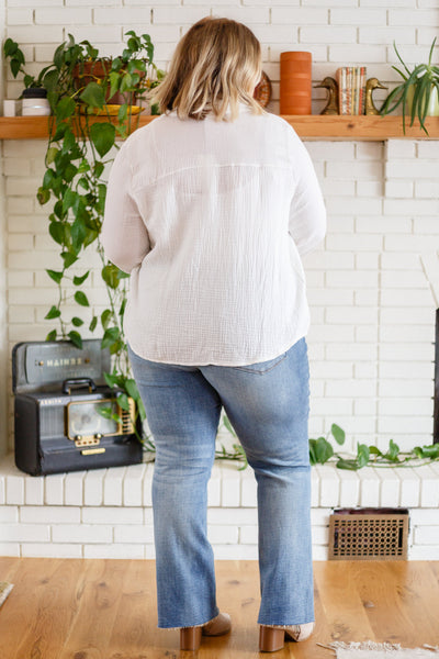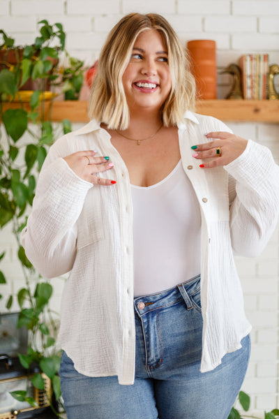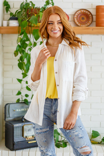 The styling opportunities are limitless when it comes to the Skies The Limit Button Up In White! Featuring A lightweight gauzy knit that shapes a collared neckline topping a functional button-front ending at a rounded hem. Long sleeves with a roll tab that details this slightly oversized top is finished with front patch pockets.