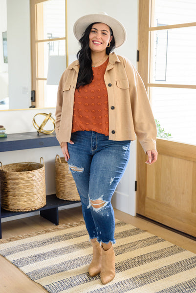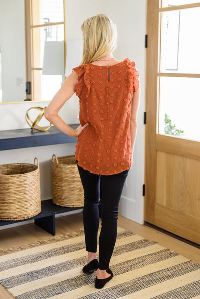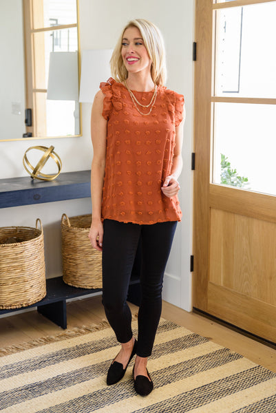 The So You Swiss Dot Top in Rust is here for you when your other tops aren't! A round neckline, ruffle hem sleeves, slightly rounded hem and Swiss dot detailing come together to create a beautiful top. Pair with dark wash denim, nude boots, and a lightweight jacket or sweater for a chic look.