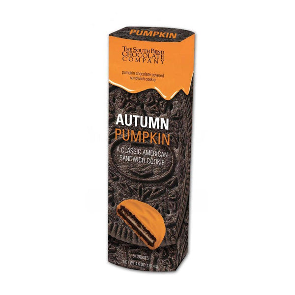 Chocolate sandwich cookies covered in pumpkin spiced chocolate.