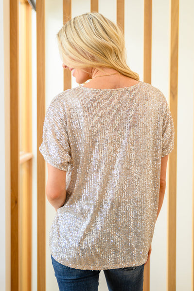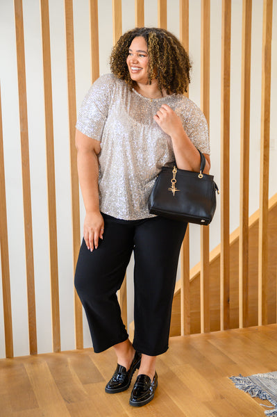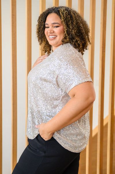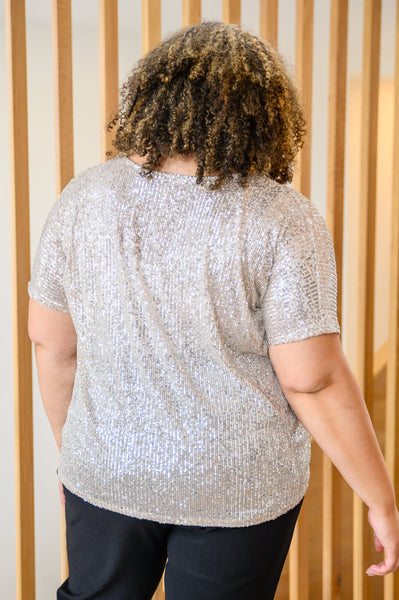 The Sparkling Night Blouse In Silver can always cure the morning blues! This fun statement top features a slight scoop neckline with shot sleeves and a loose fit-straight cut bodice. Pair this glamorous top with trousers and your favorite blazer for a chic & sophisticated look!