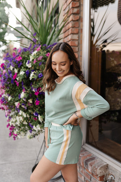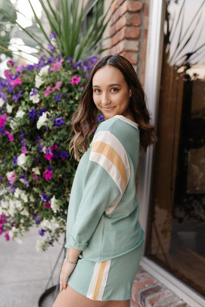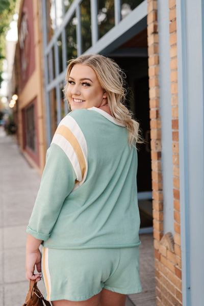 The top to your Sport A Mint Shorts. We are loving the fun retro vibe of this outfit and if we could go back to the days of roller skates, Slip and Slides and Grape Nehi, we just might!! Grab this outfit, bring up Threes Company on the big screen and chill with us.