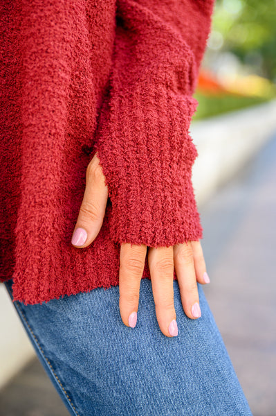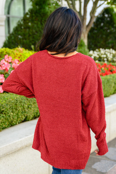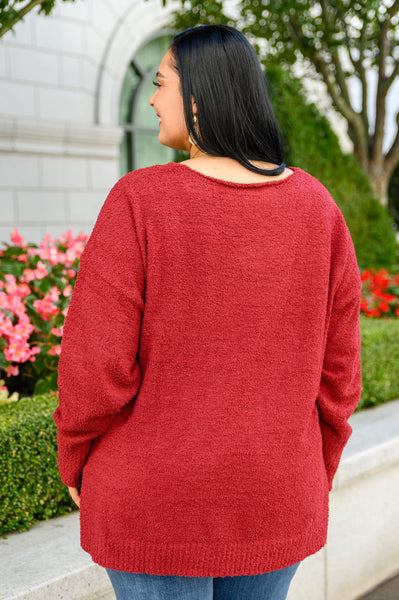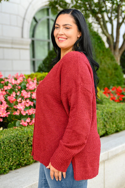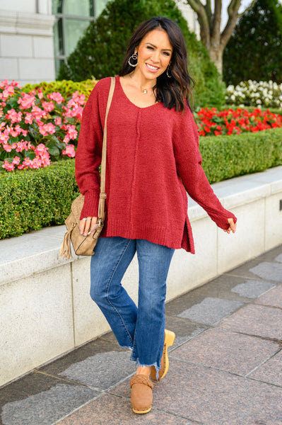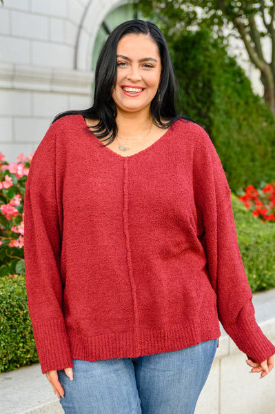 Make everyday a cozy one when you're wearing the Start Of Something New V Neck Sweater In Burgundy! An ultra soft boucle knit shapes a v-neckline with drop shoulder detail and slouchy long sleeves. An oversized bodice features an exposed seam down the middle with a hi-low silhouette, side slits, and a ribbed hem and sleeve cuffs with a thumb hole.
