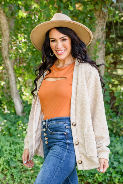 This fuzzy teddy cardigan will keep you warm and cozy all season long! It features a contrasting ribbed button placket with three buttons half way down and two front patch pockets. You can style this cardigan with a bodysuit underneath and either leave it unbuttoned for that classic cardigan style, or button it up for an on trend look that won't disappoint!