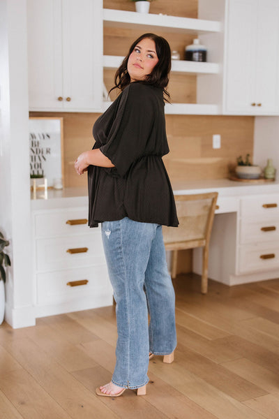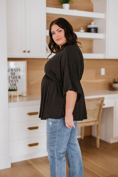 Experience timeless fashion with the Storied Moments Draped Peplum Top! This classic V-neck top is crafted from a jersey knit and features an elastic waistband and draped half sleeves that flatter all figures. The subtle peplum adds just the right amount of femininity. Enjoy effortless style every time you slip it on!