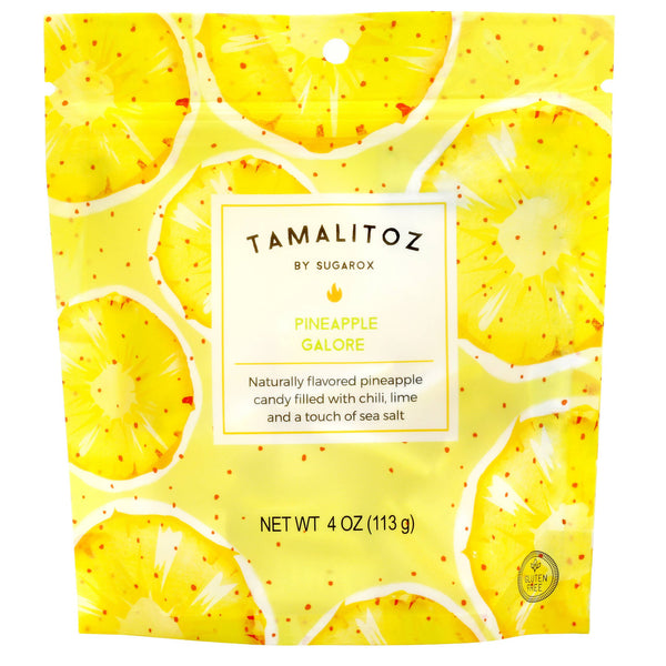 Pineapple Galore- There is a Town called Loma Bonita in the state of Oaxaca Mexico, that is all about Pineapple. Something about the soil, the weather and the warm people that make Loma Bonita home to the sweetest pineapple in the country. Its actually called 'Piña Miel which means honey pineapple because its so sweet. Naturally flavored and colored ribbon style candy filled with our own blend of mild chili powder, dehydrated lime juice and a touch of sea salt