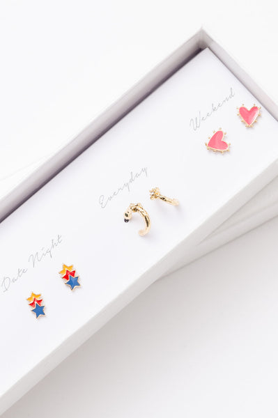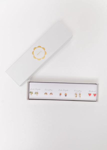 The Sunny State Of Mind Box Earring Set has you covered for all your events! Featuring a five pack set of gold earrings each designated to a specific outing whether it's everyday wear, GNO, date night or the weekend, this earring set is here for you!