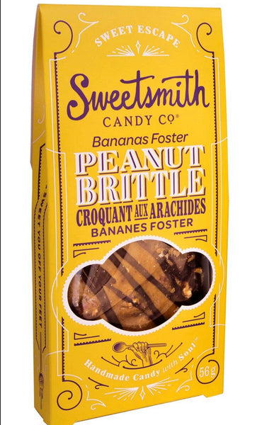Banana Foster Peanut Brittle- Bruleed bananas, rum, brown sugar, and cinnamon are blended to crunchy perfection, then topped with delightful dark Belgian chocolate. Contains peanuts, and soy.