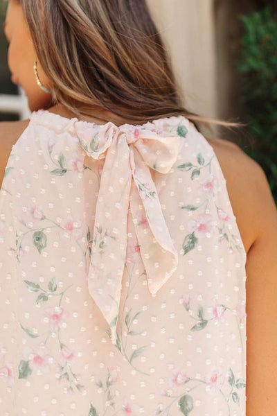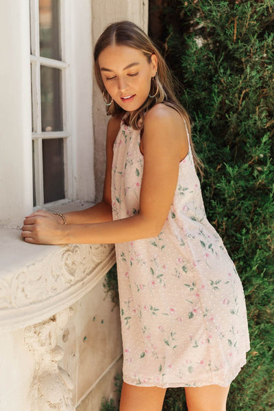 The Swiss Dot Floral Dress is fun and feminine. This halter style dress has a cute neck tie detail and darling small floral print. Wear this with heels and a straw bag for a perfect summer evening.