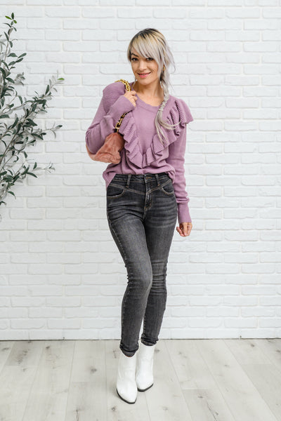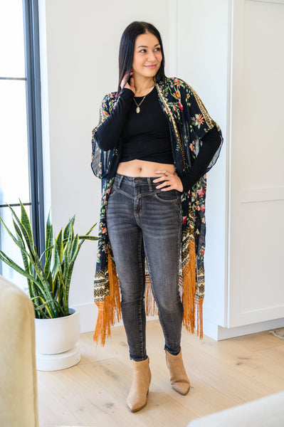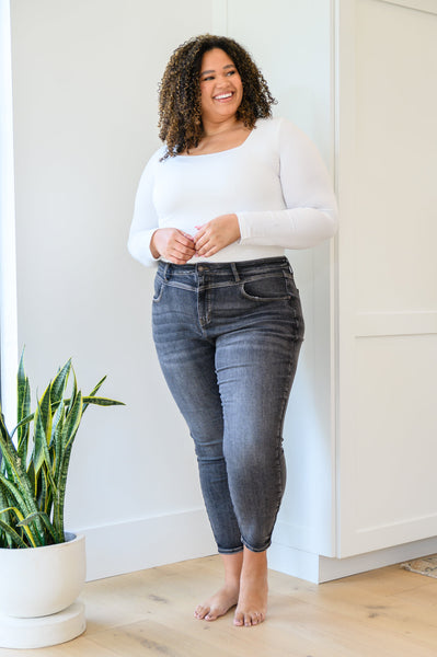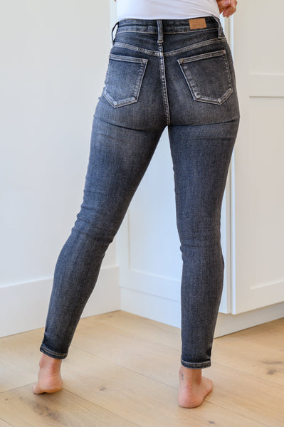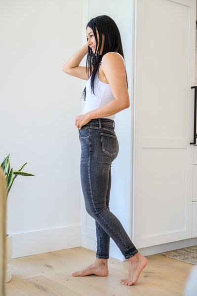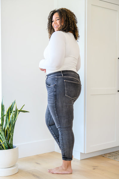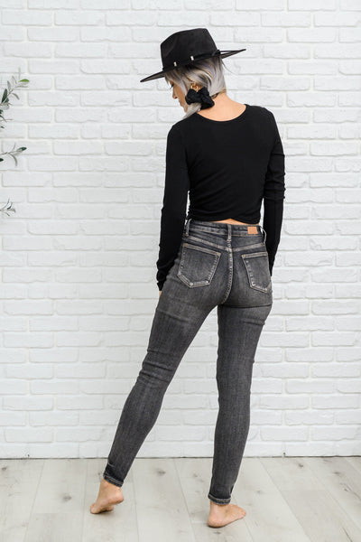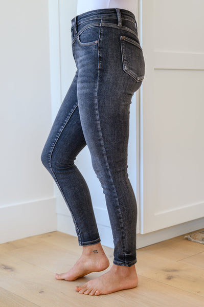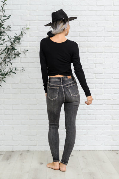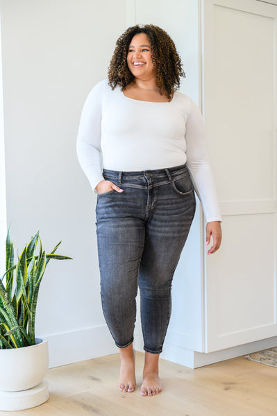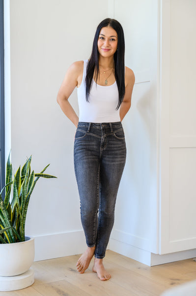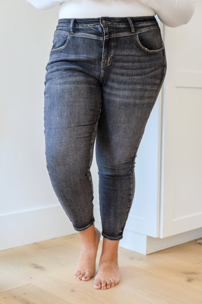 Make a scene in the Tabitha Front Yoke Skinny Black Wash Jeans! These amazing jeans feature a hi rise, decorated with a yoke detailing, a skinny ankle length fit with contrasting orange stitching, and lived-in fading. Pair them with your favorite sweater!