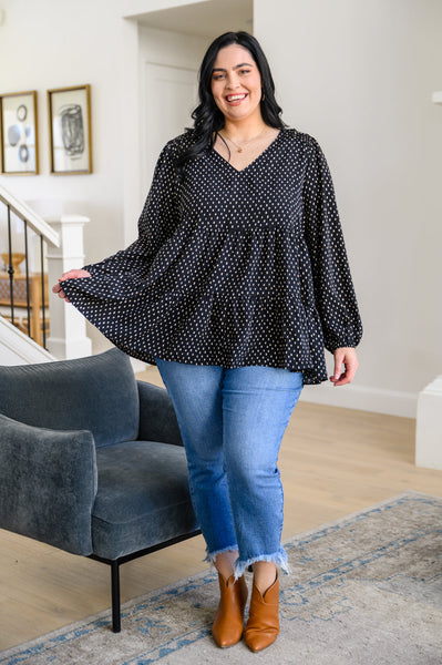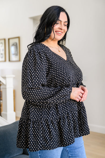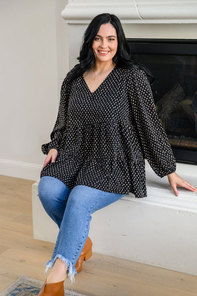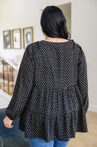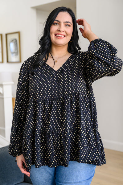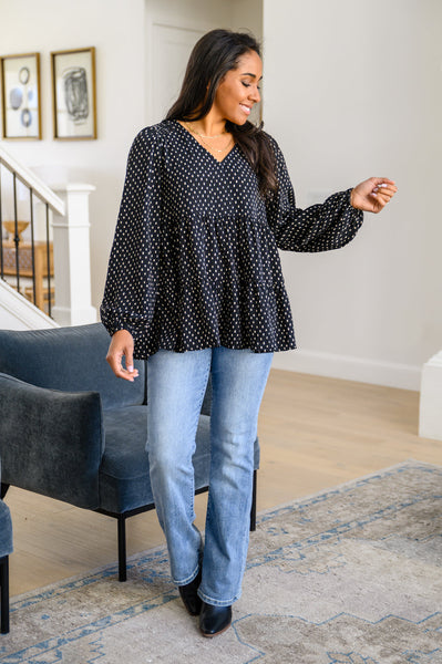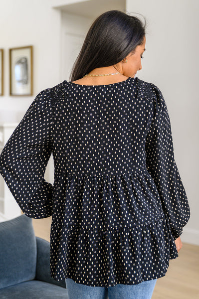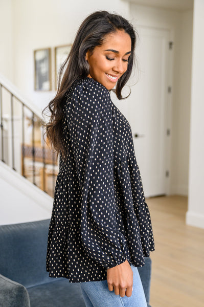 The Tell Me I'm Your Dot Print Tiered Blouse is about to become your new favorite top! Lightweight, non-stretch fabric shapes a v neckline with long balloon sleeves ending at elastic cuffs. The flowy bodice is complete with a two-tiered hem and smocked shoulder panel detail.