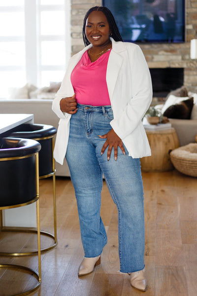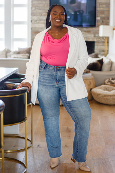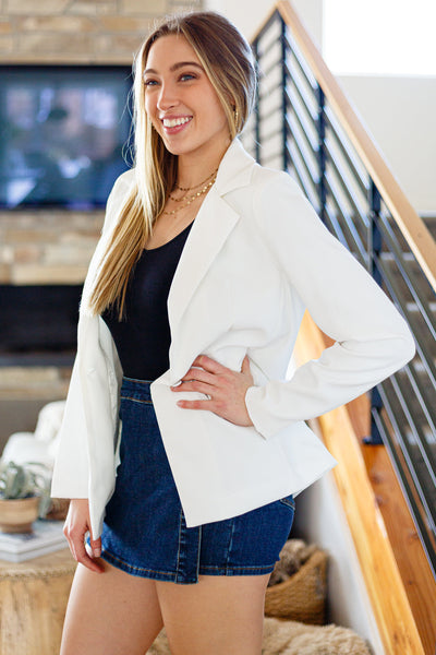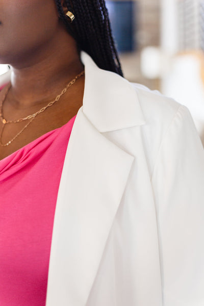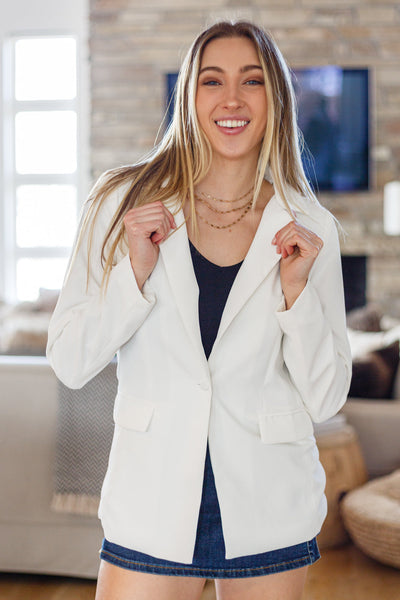 The Harvard Blazer will help you achieve the most effortlessly chic looks! Featuring a white non stretch fabric that shapes a collared neckline with notched lapels, falling into an open front with single button closure. Long sleeves frame this blazer with kick pleat detail and front flap pockets.