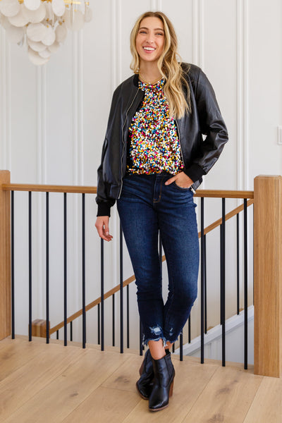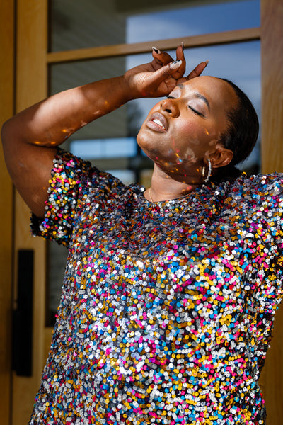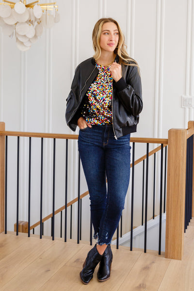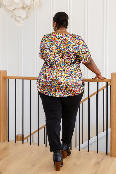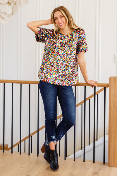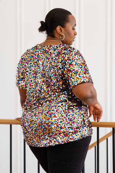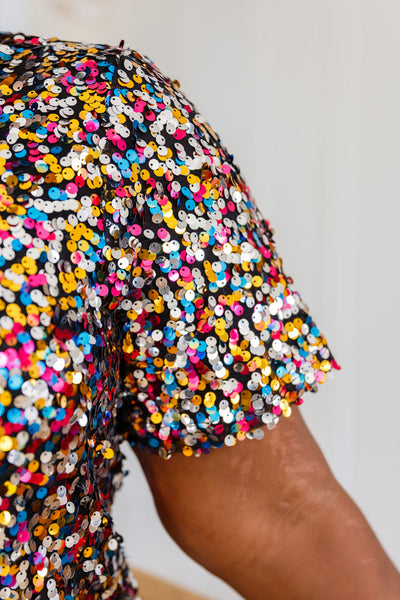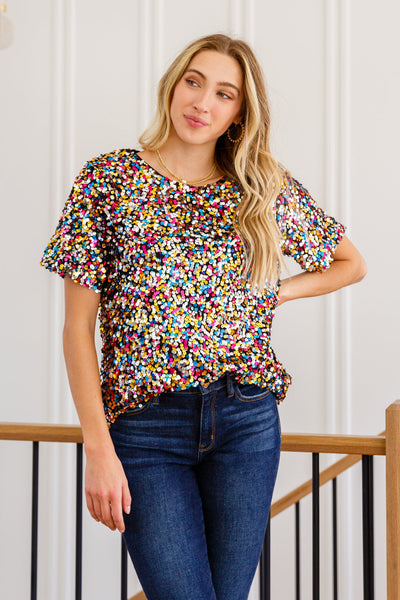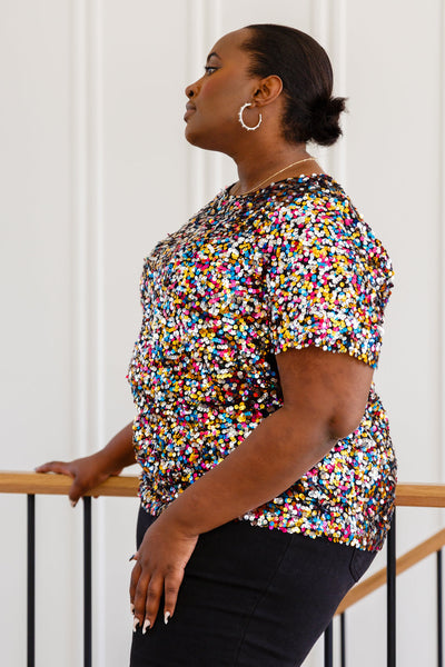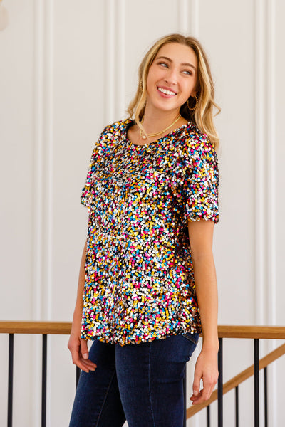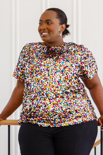 Cause a little commotion in the Times Square Sequin Short Sleeve Top! This stunning top features a scoop neckline with short sleeves, a loose fit, and straight cut bodice. A mesh overlay embellished with colorful sequins make this top a total statement piece! Whether you're headed out to dinner, or on a night out with the girls this top is the perfect pick!