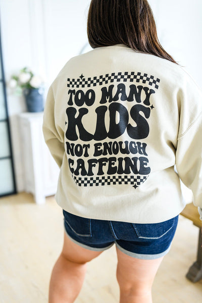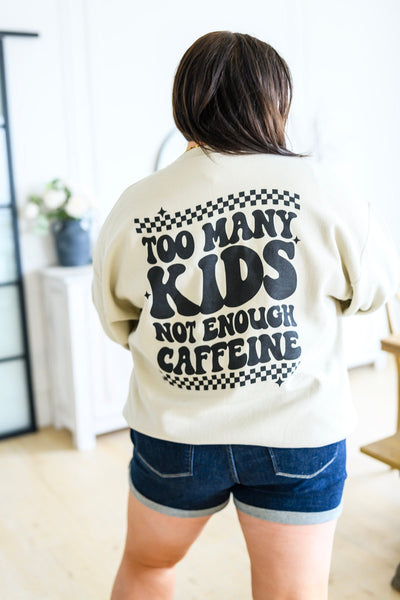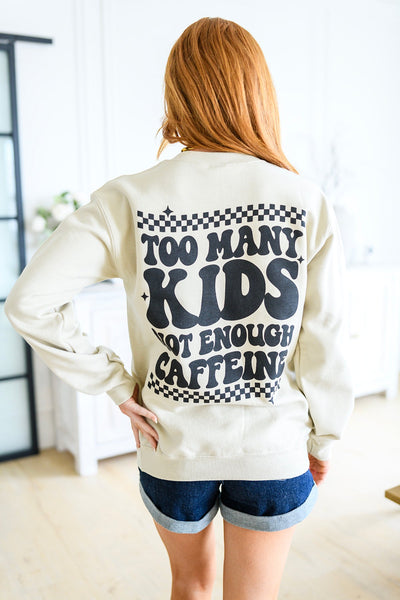 Wear the mantra for busy mamas everywhere, Too Many Kids, Not Enough Caffeine! This classic sand colored crewneck sweatshirt is equal parts cozy and cool, while the statement back graphic will have you telling us how it really is. This will be the go-to sweatshirt for any mama in your life.