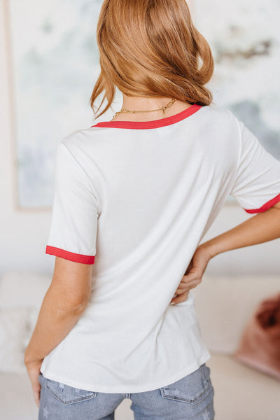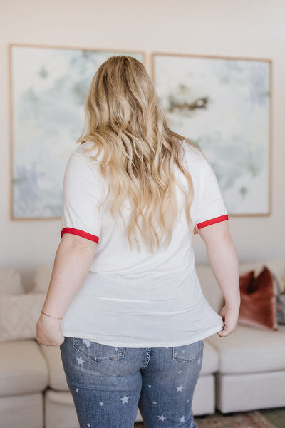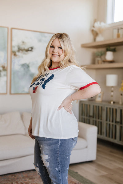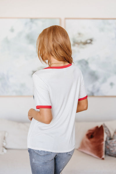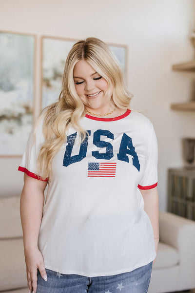 Be patriotic and stylish with this USA Ringer Graphic T-Shirt! Featuring a classic throwback style and a distressed USA graphic, this white jersey knit t-shirt with red ringer details will show off your love of the country in style.