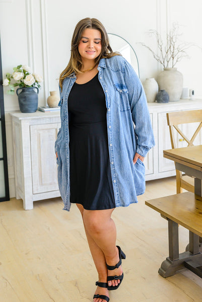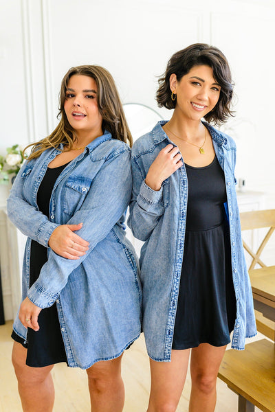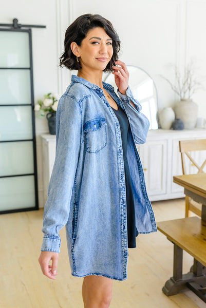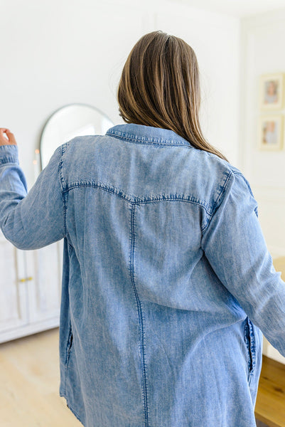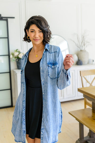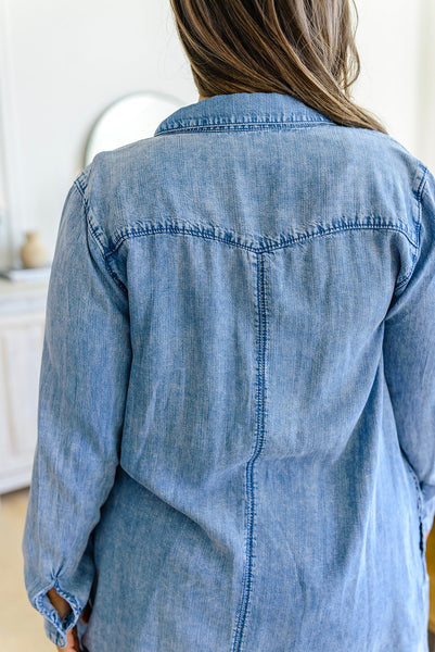 This Westward Calling Chambray Button Up Shirt is your go-to for easy style that speaks volumes. It's got a longline cut, lightweight chambray, and functional buttons, plus two breast pockets and two side seam pockets – in other words, everything you need to look cool and stay comfortable. With this shirt you can check all the boxes for fashion, function, and fun!