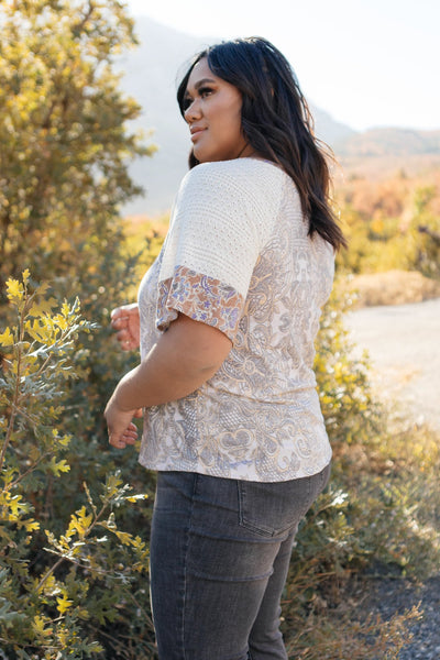 When pattern meets knit a beautiful thing happens! This top has a wild and colorful pattern covering it and has a textured, lightweight knit that covers the shoulders. It has a rounded neckline and flowy short sleeves. This top is perfect on its own and it also looks fabulous paired with cardigans, jackets, and coats.