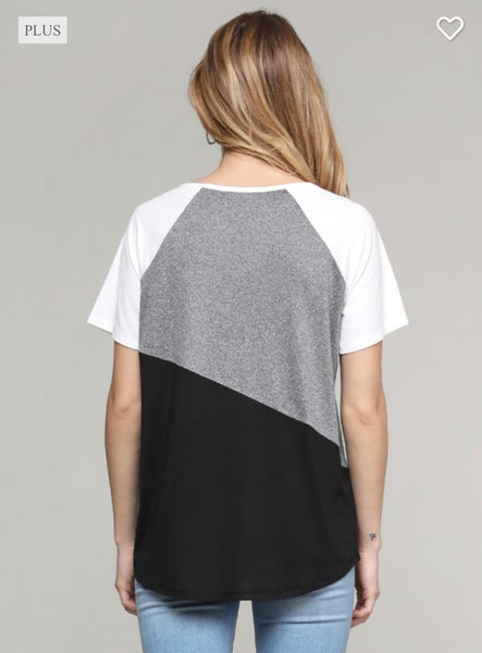 This top is a round neck raglan. The short sleeves and color block are perfect for every day wear. We're loving the asymmetric design on this one!