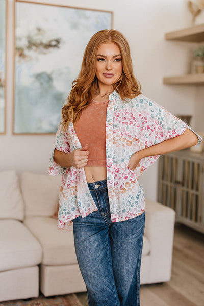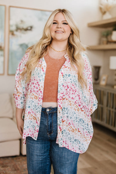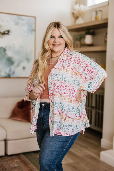 Treat yourself to a unique, eye-catching style with the vibrant Wild Rainbow Blouse! Featuring a stunning animal print in a rainbow ombre color scheme, this boxy fit blouse features a button front closure, collared neckline, and dolman sleeve with split cuffs. Spice up your wardrobe today!