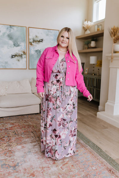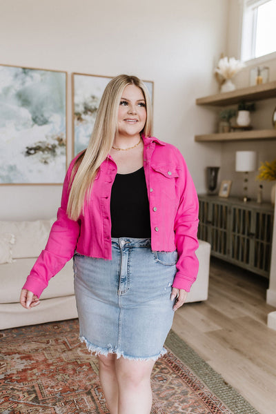 Make a statement with the With a Whisper Denim Jacket in Hot Pink! This ultra-stylish jacket features a super stretchy denim twill, a classic denim jacket cut and a cropped length with a raw hem. It's fitted for a flattering silhouette and features classic silver buttons. Dare to be bold with this unique and fun piece.