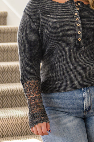 Your closet just got a much needed upgrade with the With My Bestie Washed Thermal Henley! Lightweight washed thermal knit shapes a wide neckline with functional henley design. Long sleeves with contrasting lace cuffs and a slight a-line silhouette create a fashionable look you'll love.