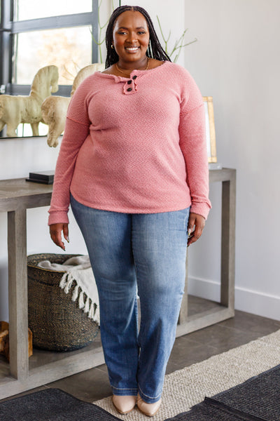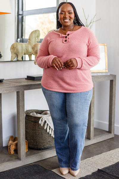 We can't wait to cuddle up on the couch with our favorite book in the Wrapped Up In Books Top! Featuring a stretchy, soft knit that shapes a henley neckline topping a loose fit bodice that ends at a rounded hem. Long sleeves with drop shoulder detail and exposed seam detail frame this cozy top.