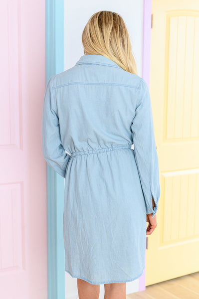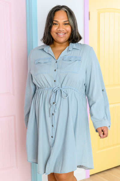 The Write Me Love Poems Dress is ready for any occasion with its washed cotton-blend chambray construction that shapes long sleeves with button cuffs and a collared neckline. A loose fit bodice features a full button placket at the front with twin patch pockets. A functional belt cinches at the waist, atop a rounded mini hem that provides a flattering finish.