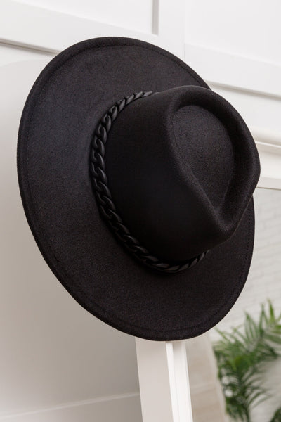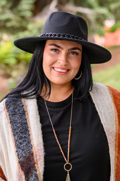 This Zaya Black Wide Brim Fedora With Chain Trim is the finishing touch to your outfit! Soft felt-like fabric shapes this cute hat that features a wide brim with a matte black chain that decorates this hat for a subtly edgy look.